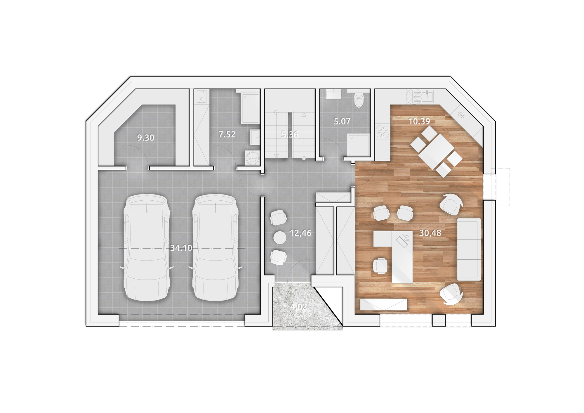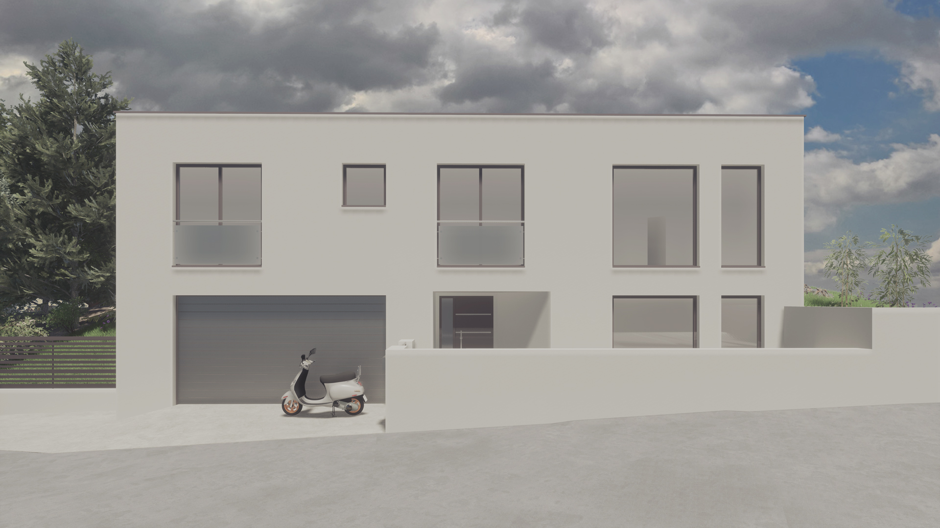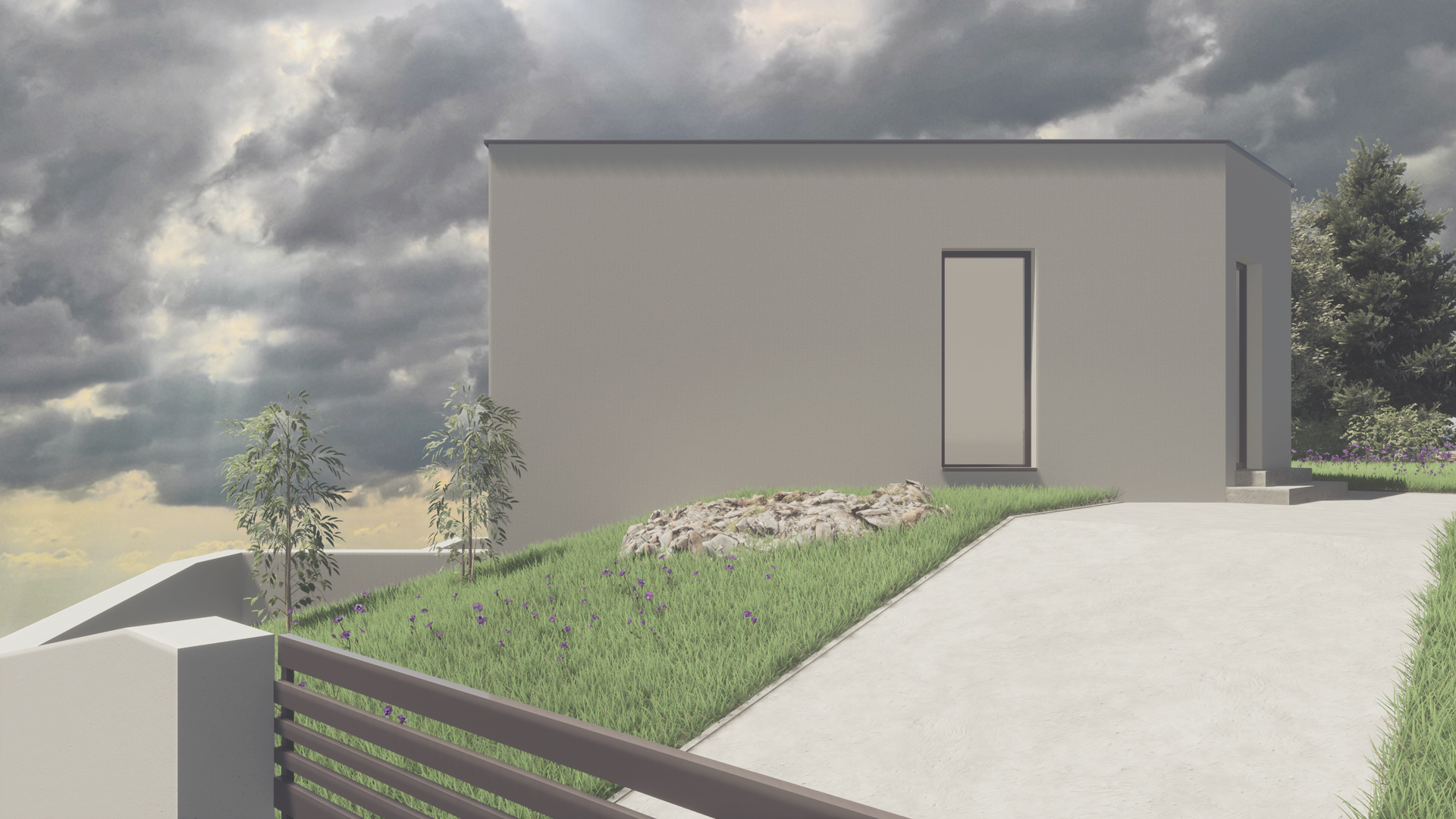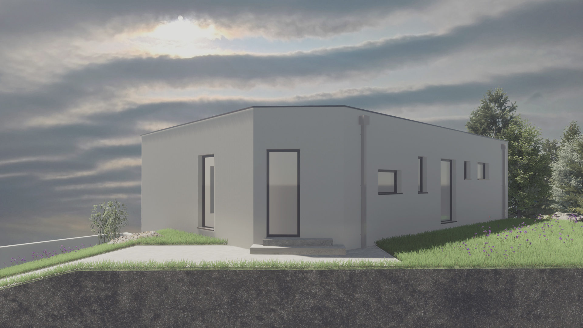 Jednoduchý, ale zaujímavý dizajn rodinného domu je špecifický skosením, ktoré bolo pri návrhu zadefinované hranicou pozemku a maximálnym využitím plochy pri rešpektovaní minimálnych odstupov.